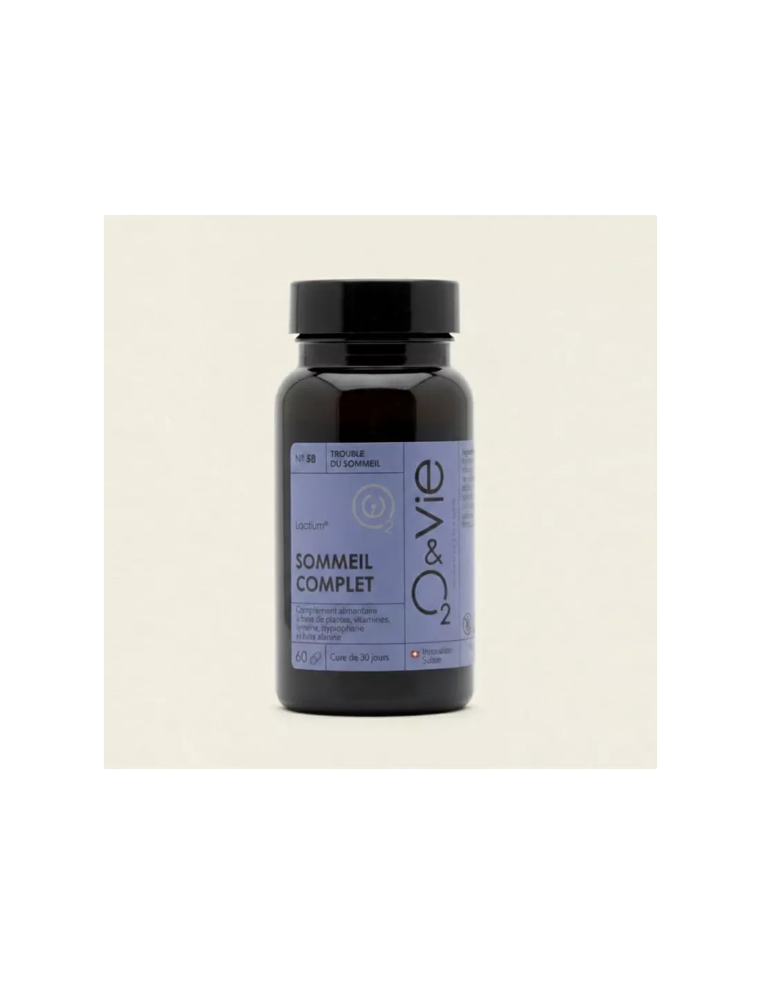 Ingrédients : Agent d’enrobage: hydroxypropylméthylcellulose, Lactium® (protéine de lait), poudre de partie aérienne de lotier corniculé (Lotus corniculatus), poudre de partie aérienne d’eschscholzia de californie (Eschscholzia californica), ashwagandha ( Withania somnifera) titré en withanolides, extrait de racine de valériane officinale (Valeriana officinalis) titré en acides valéréniques, poudre de partie aérienne de passiflore officinale (Passiflora incarnata), extrait de racine de scutellaire (Scuteflaria baicalensis), safr’lnsideTM (Extrait de stigmates de safran) ( Crocus sativus). Contient des traces de lait.