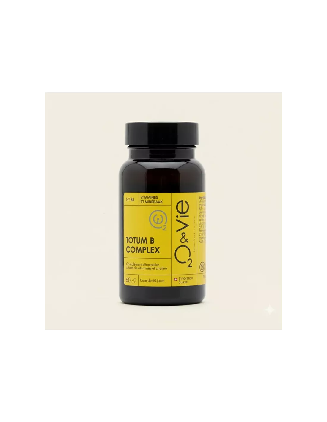 Ingrédients : Citrate de choline, agent d'enrobage : hydroxypropylméthylcellulose, nicotinamide (vitamine B3), d-pantothénate de calcium (acide pantothénique), riboflavine (vitamine B2), chlorhydrate de thiamine (vitamine B1), chlorhydrate de pyridoxine (vitamine B6), acide (6s)-5-méthyltétrahydrofolique sous forme de sel de glucosamine, d-biotine (vitamine B8), méthylcobalamine (vitamine B12).